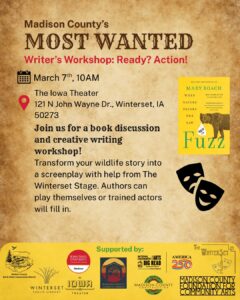 Transform a wildlife story into a screenplay with help from The Winterset Stage. Authors can play themselves or trained actors will fill in.