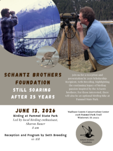 Join us for a reception and presentation by 2026 Schantz Brother’s Foundation Scholarship Recipient, Seth Breeding, highlighting the continuing legacy of birding passion inspired by the Schantz brothers. This will start at 10 AM at the Madison County Conservation Center in Pammel Park.