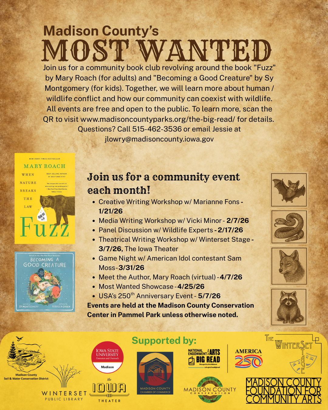 A collaboration of Madison County organizations is proud to announce the awarding of a grant from the National Endowment for the Arts (NEA) Big Read program. This year’s theme is nature, and we have chosen the acclaimed book Fuzz: When Nature Breaks the Law by Mary Roach.