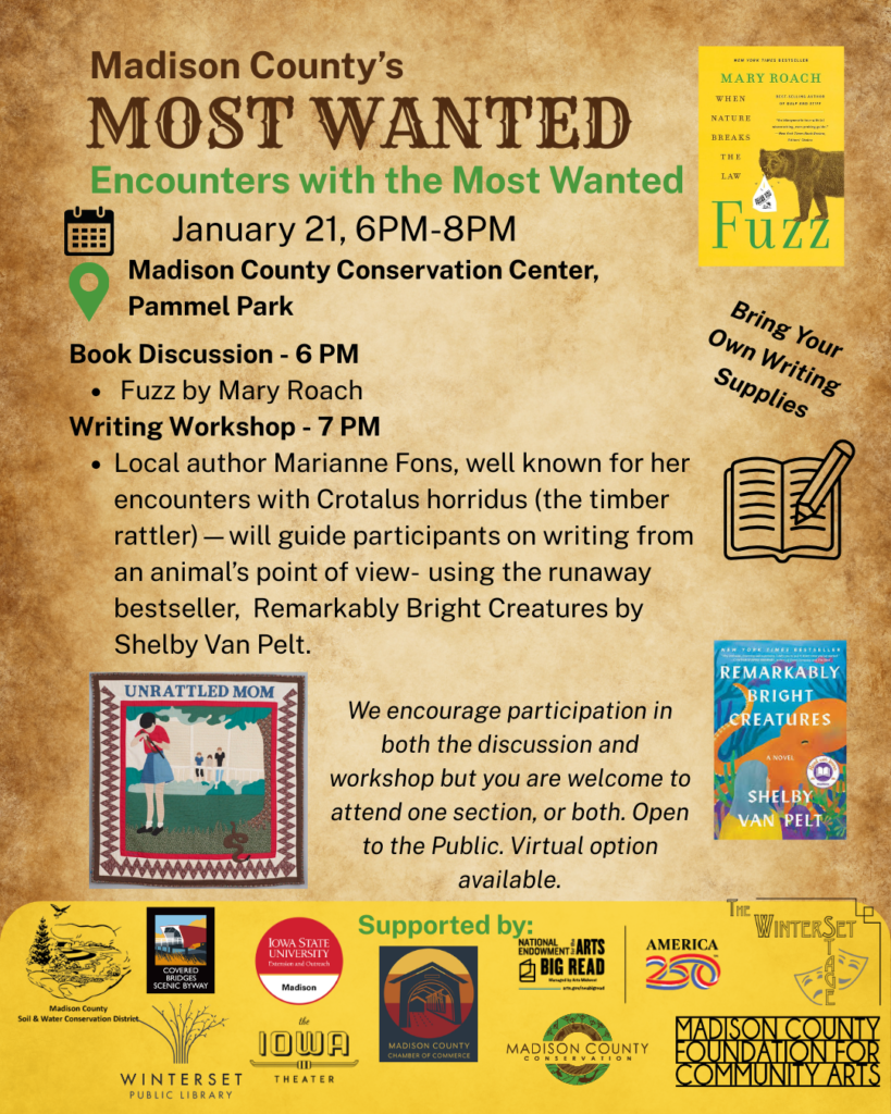 The program will feature writers’ workshops, book discussions, community art projects, and more—all exploring the fascinating and sometimes humorous world of human-wildlife conflict, as portrayed in Fuzz. Themes from the book will be localized to highlight animals encountered in Madison County, including rattlesnakes, foxes, coyotes, and bats…as well as an exotic perspective all the way from the island of Madagascar!